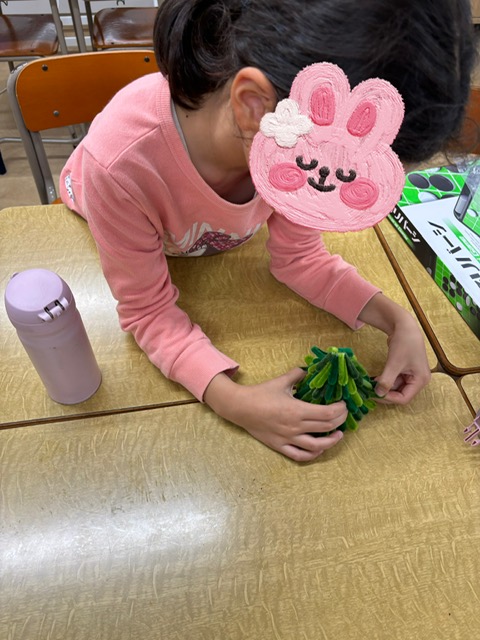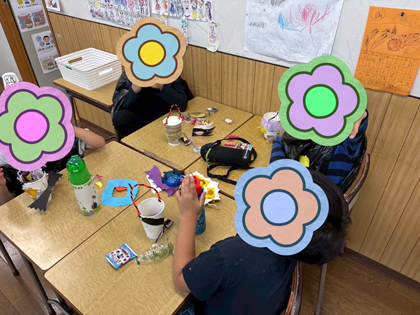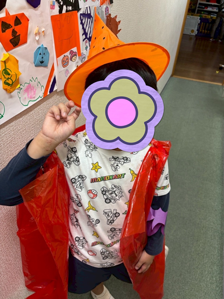 当日は子ども達が揃ったらスタッフも含めみんなで仮装をしました!工作プログラムで作った服や仮面、事前に準備していた帽子やアクセサリーを身につけました!