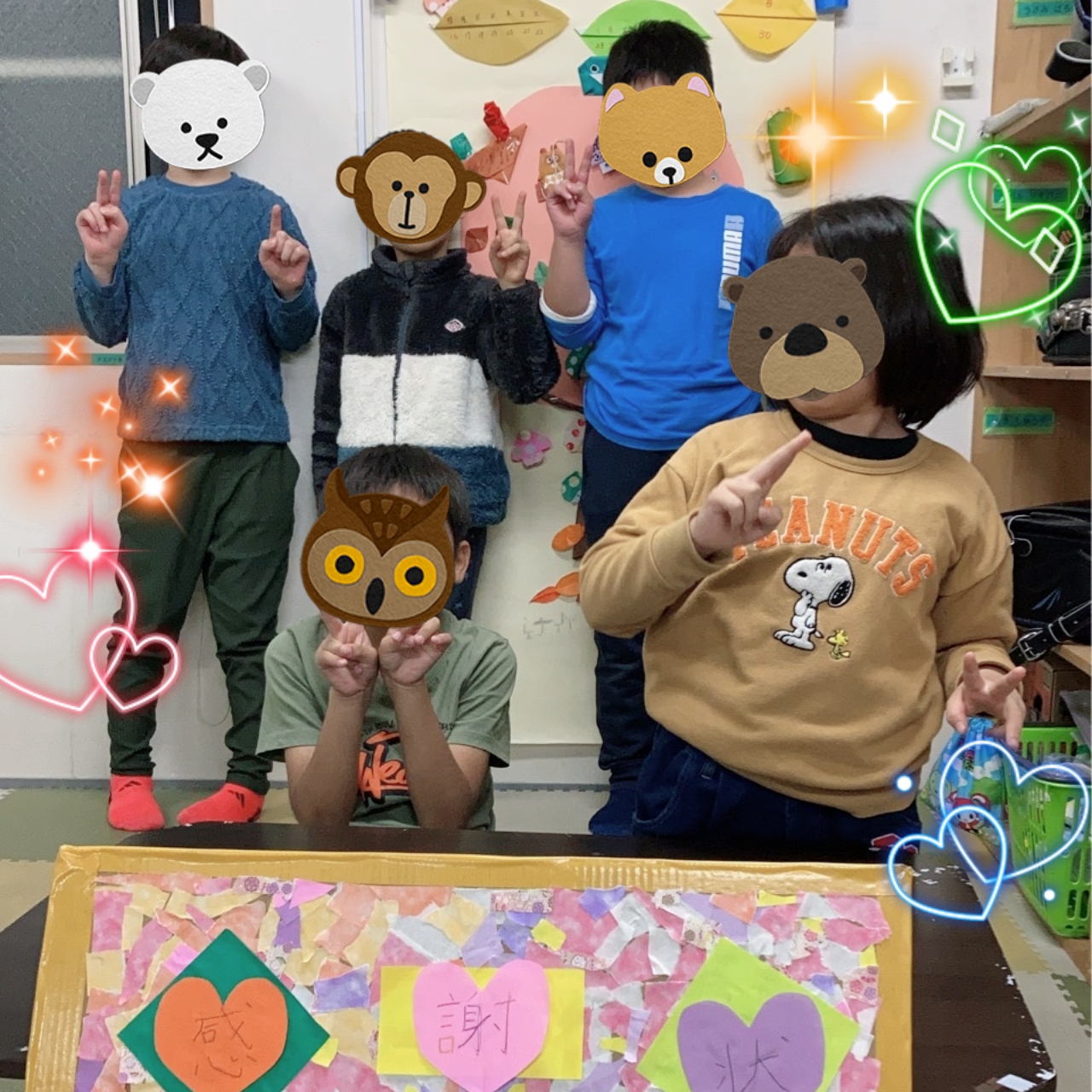 室内活動では、たくさんの工作活動を行いました。今年は勤労感謝の日に向けて、大きな大きな感謝☆カードをみんなで作りました。感謝の気持ち、届きますように・・・。毎日いろいろな物を作り続けていることもあり、どの部屋も工作スキルが格段に上がったように感じます☆