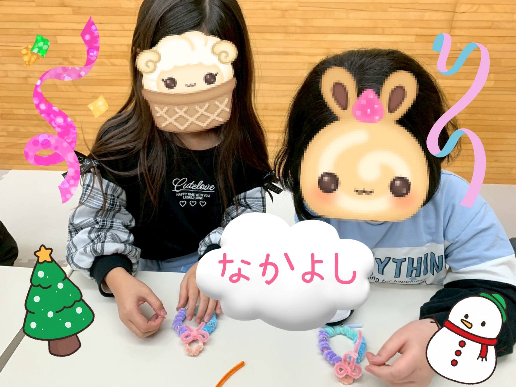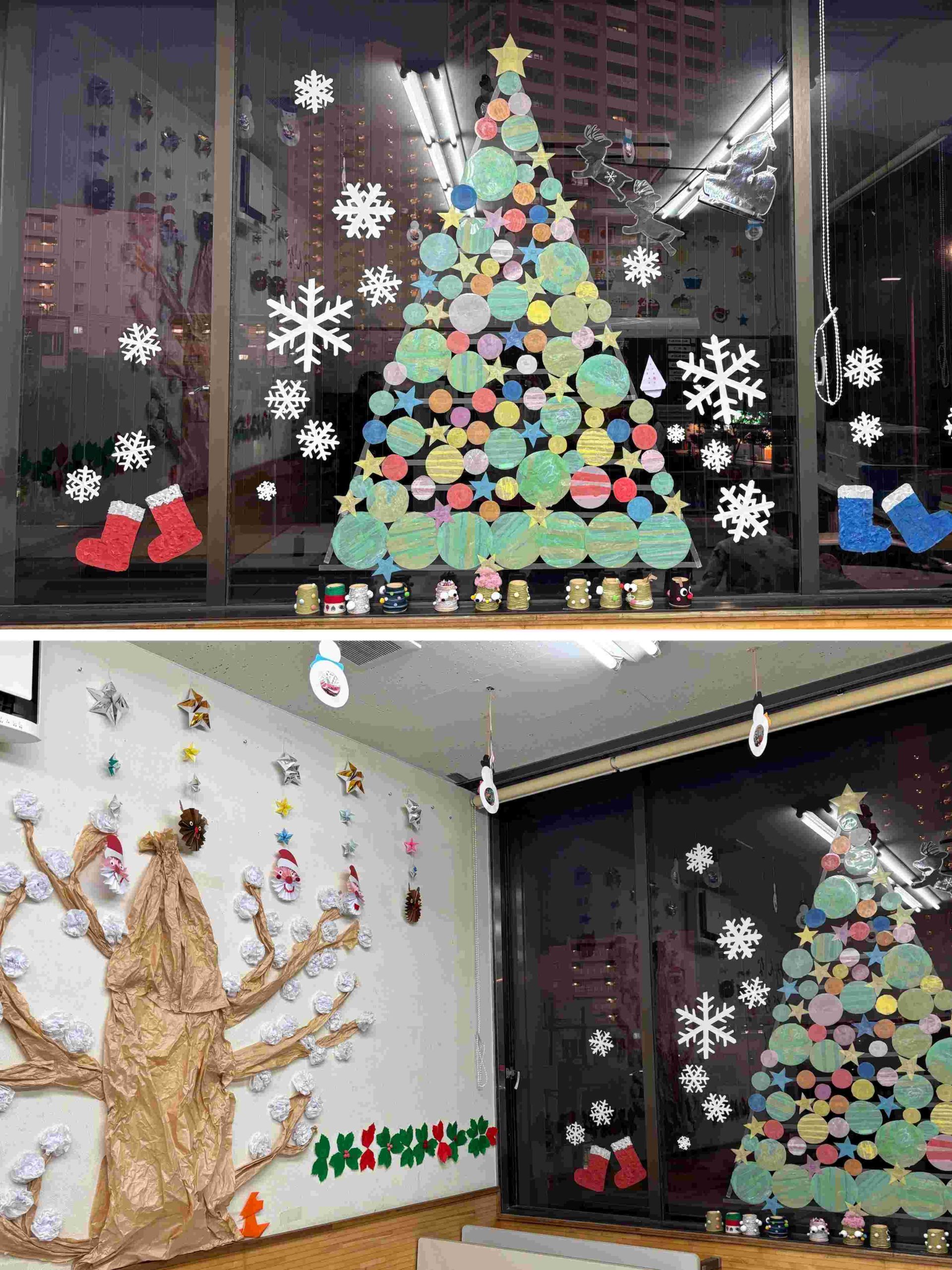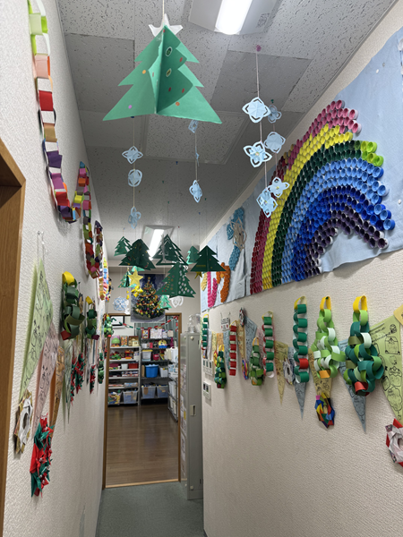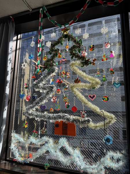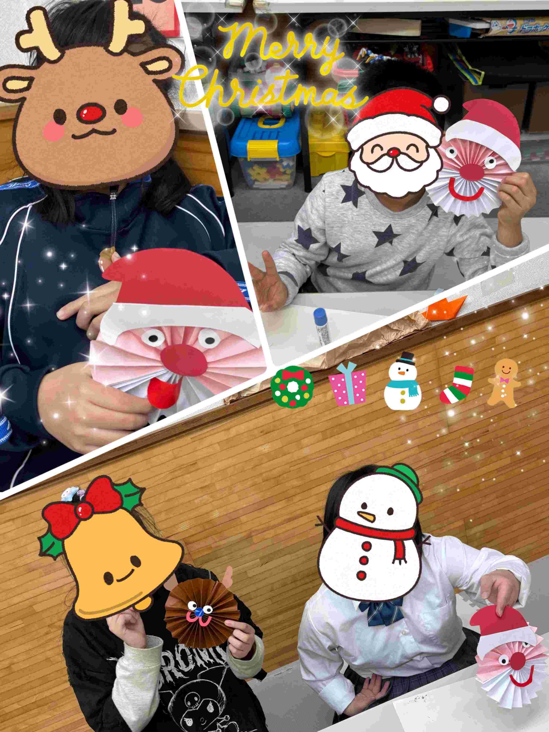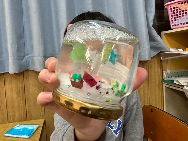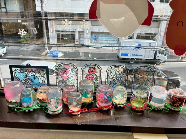 折り紙などでクリスマスツリーやリース、雪の結晶を作りお部屋の至る所に飾ったり、工作プログラムではグラスデコやスノードームを作成しました😄そして、スノードームの中に入れている飾りは、子ども達がレジンを用いて丁寧に作った、手作り仕様になっています🤩作成したグラスデコは教室の窓に沢山飾られていて、とても色鮮やかに教室を彩ってくれています!!