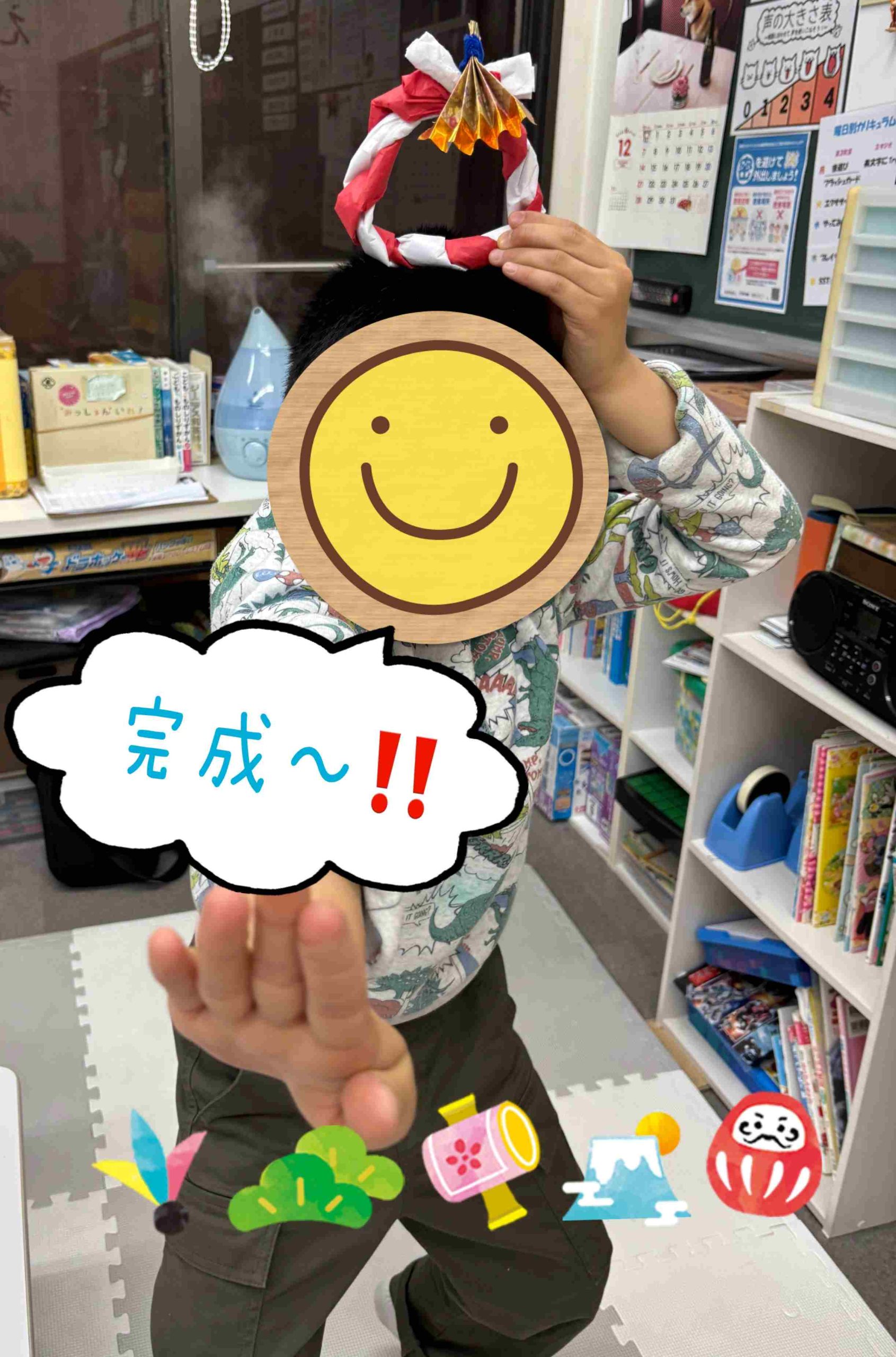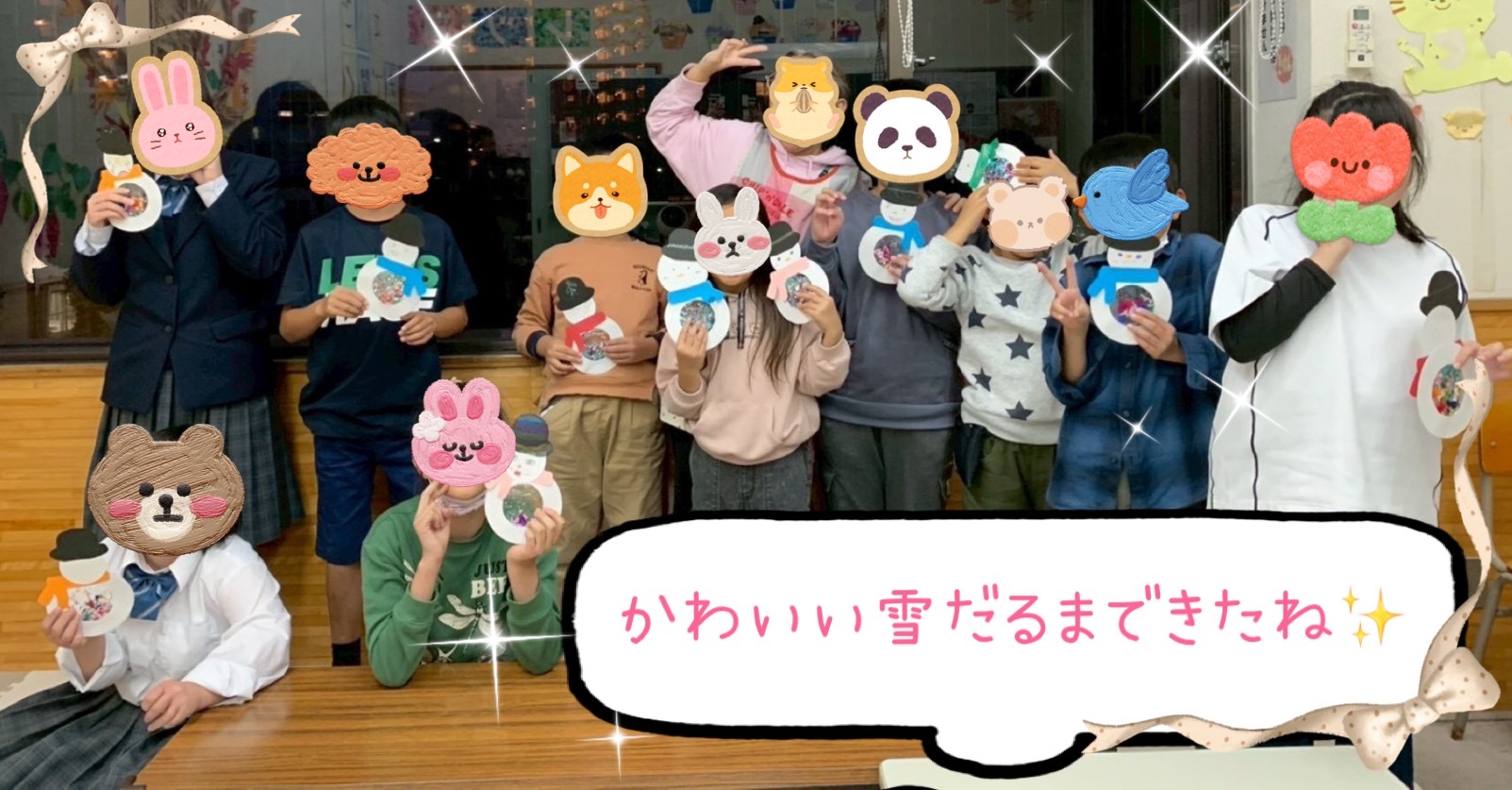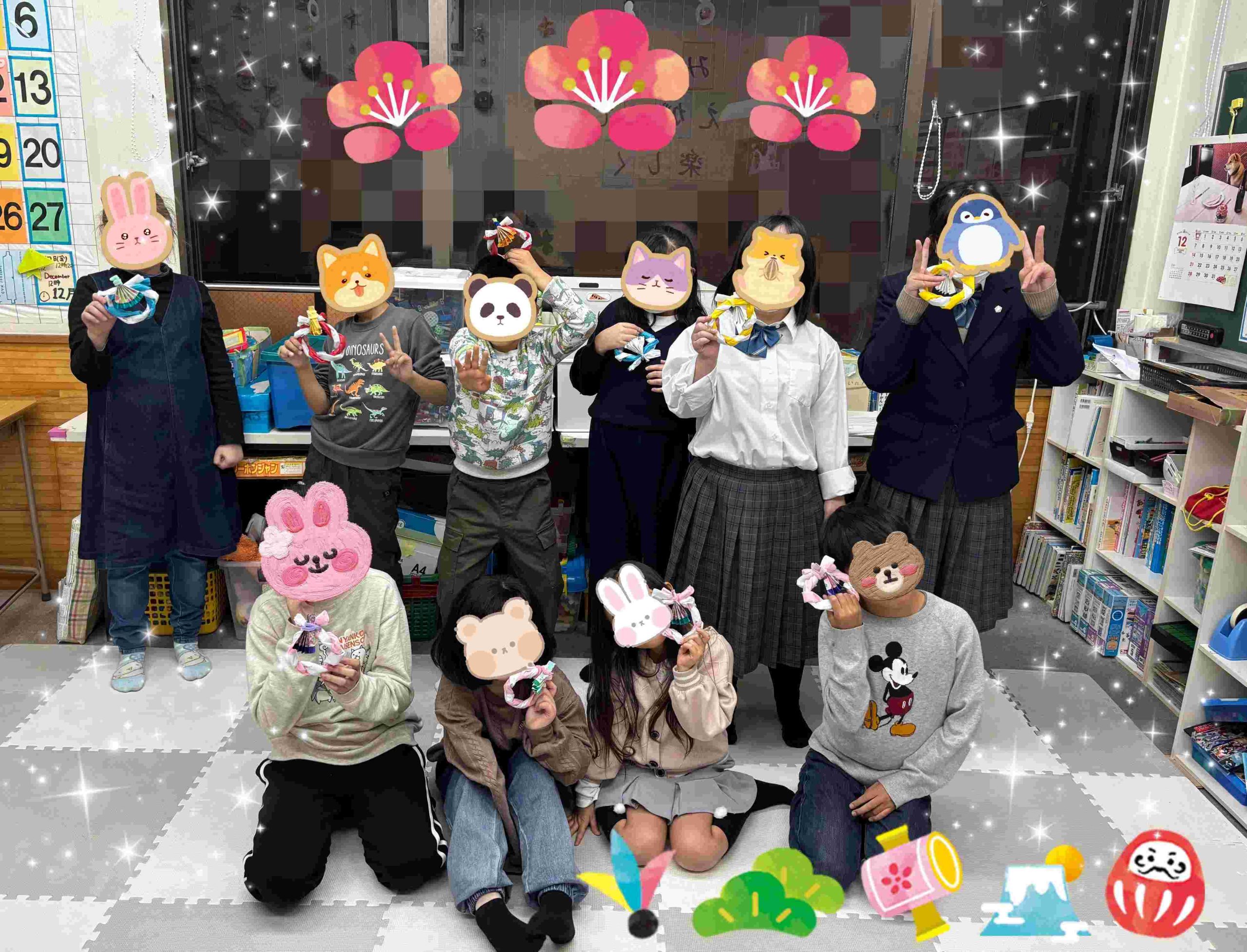 折り紙などでクリスマスツリーやリース、雪の結晶を作りお部屋の至る所に飾ったり、工作プログラムではグラスデコやスノードームを作成しました😄そして、スノードームの中に入れている飾りは、子ども達がレジンを用いて丁寧に作った、手作り仕様になっています🤩作成したグラスデコは教室の窓に沢山飾られていて、とても色鮮やかに教室を彩ってくれています!!