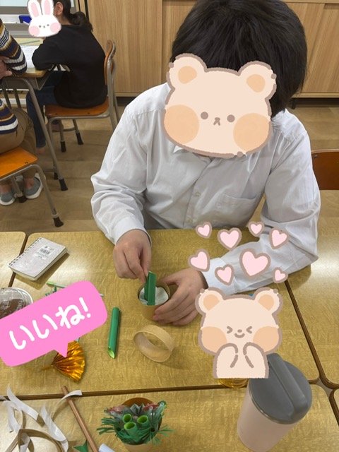 門松のパーツを、紙粘土を入れたカップにどんどん差していきます!