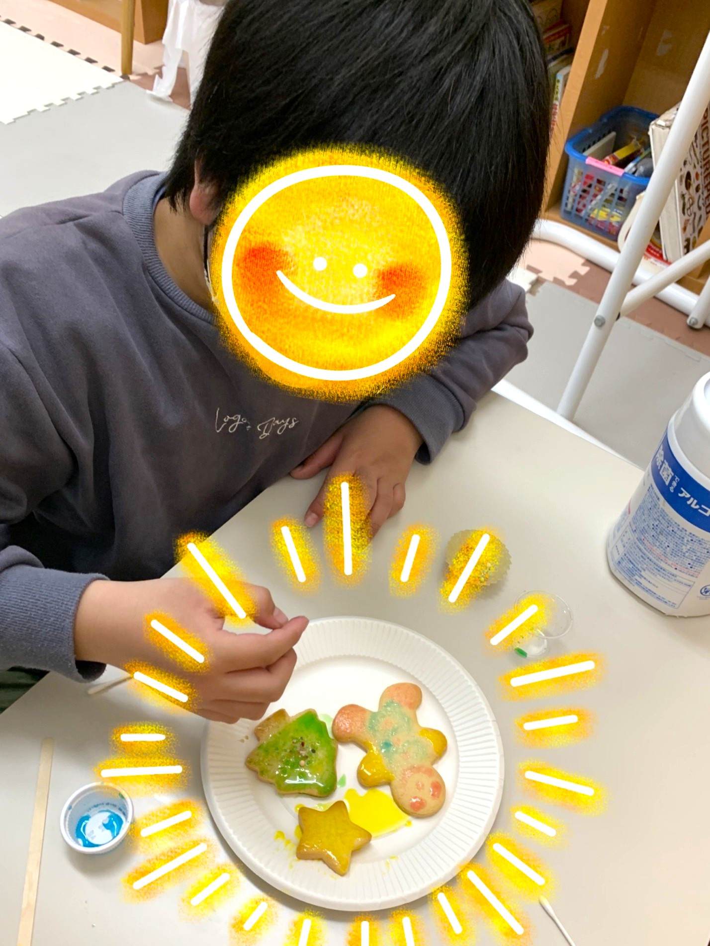 子どもたちがとても楽しみにしている、Y先生が焼いてくださったかわいいクッキーにアイシング🍪