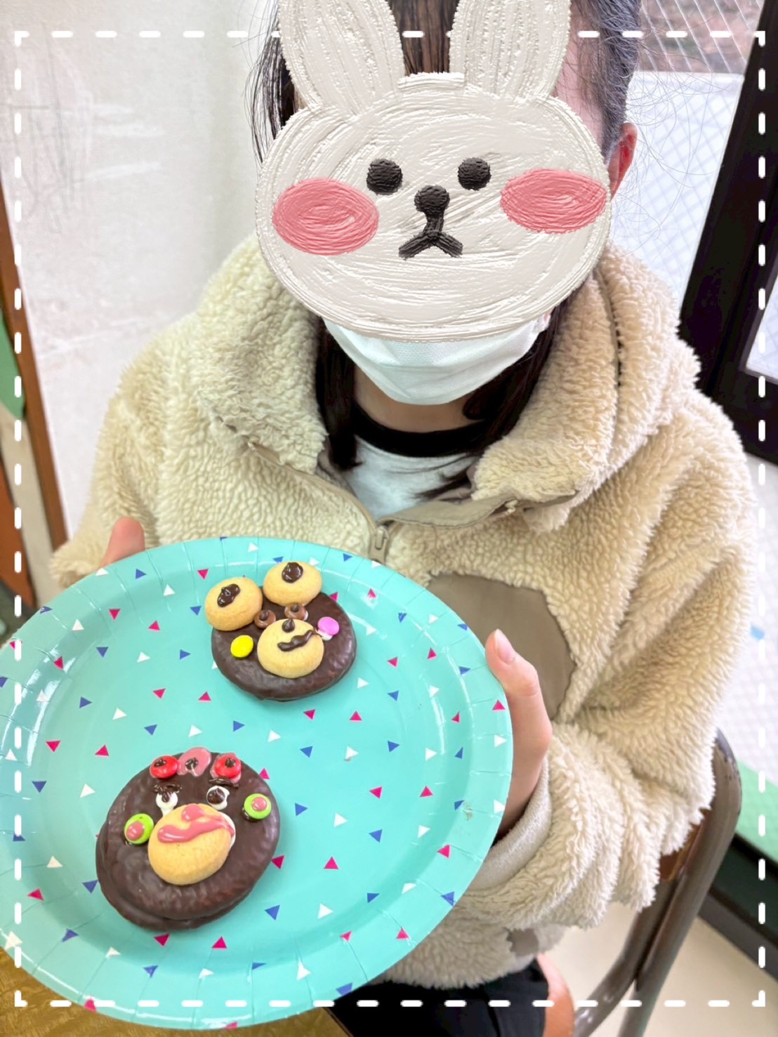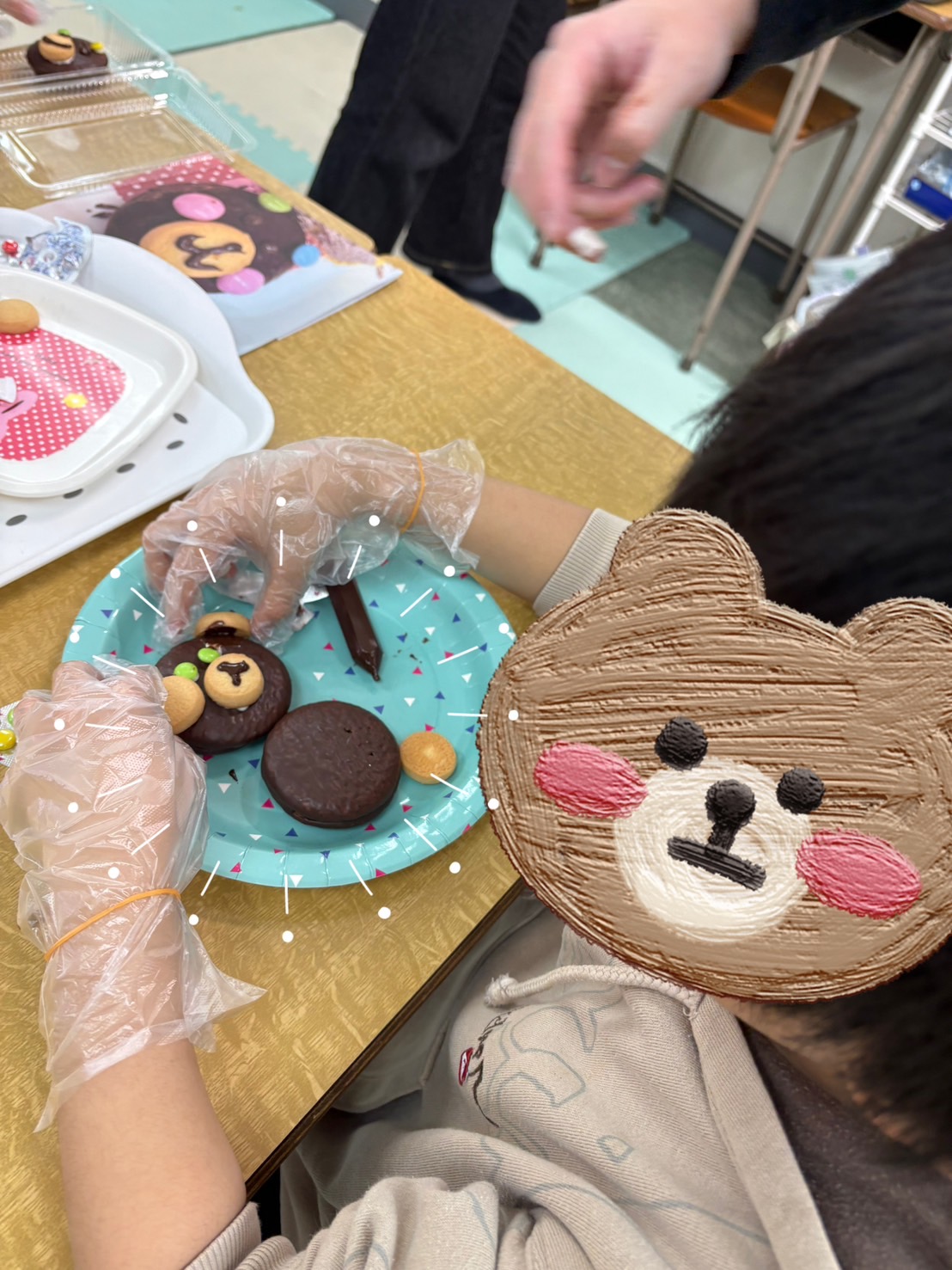 チョコパイはくまさん🐻の顔を作り、ロールケーキは好きなようにデコレーションしました!