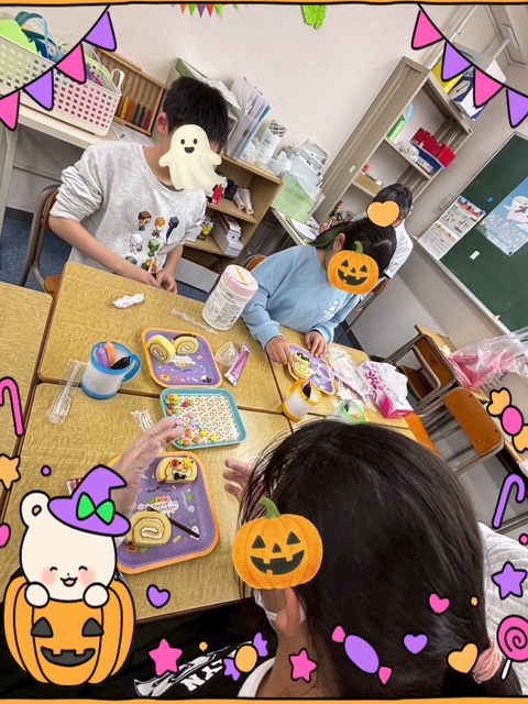ロールケーキに、チョコペン・ポッキー・マーブルチョコを飾り付け!みんな集中して作っていました😆
