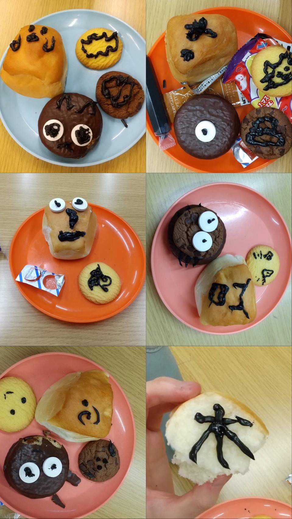 チョコペンで、クッキー&チョコパイ&パンをお化けに変身させました!