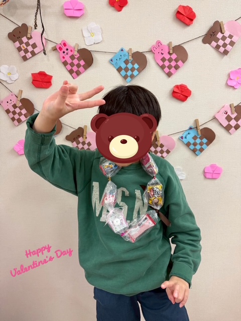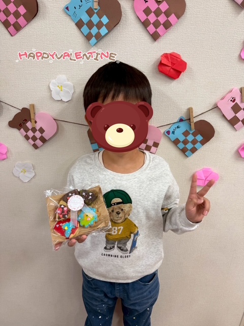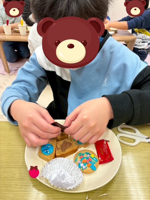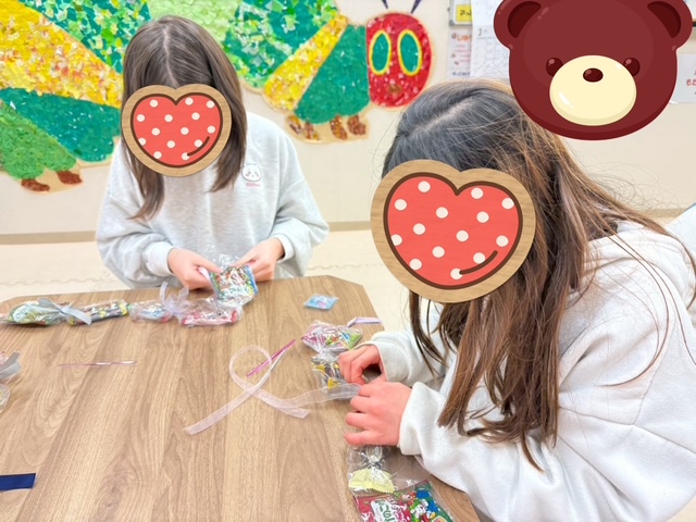 今年も平日のカリキュラムではチョコ系のお菓子を袋に包んでリース作り🍫