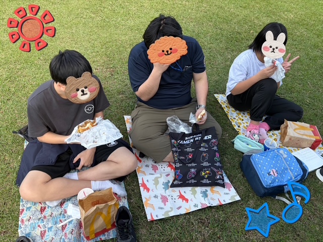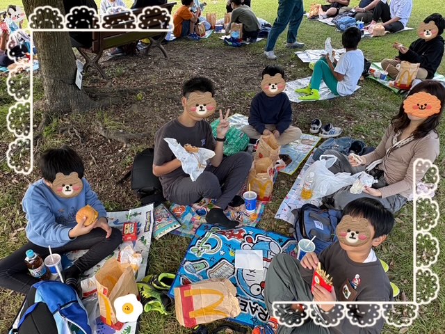 祝日のお出かけで、うみのことりでに遊びに行きました!遊ぶ前に、みんなでレジャーシートを敷いてマックを食べました🍔 🍟