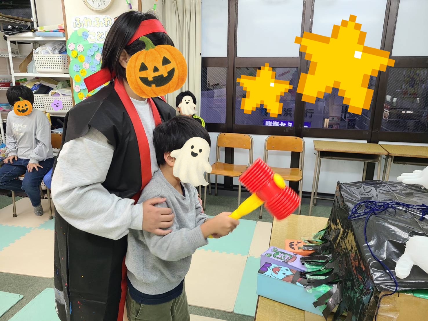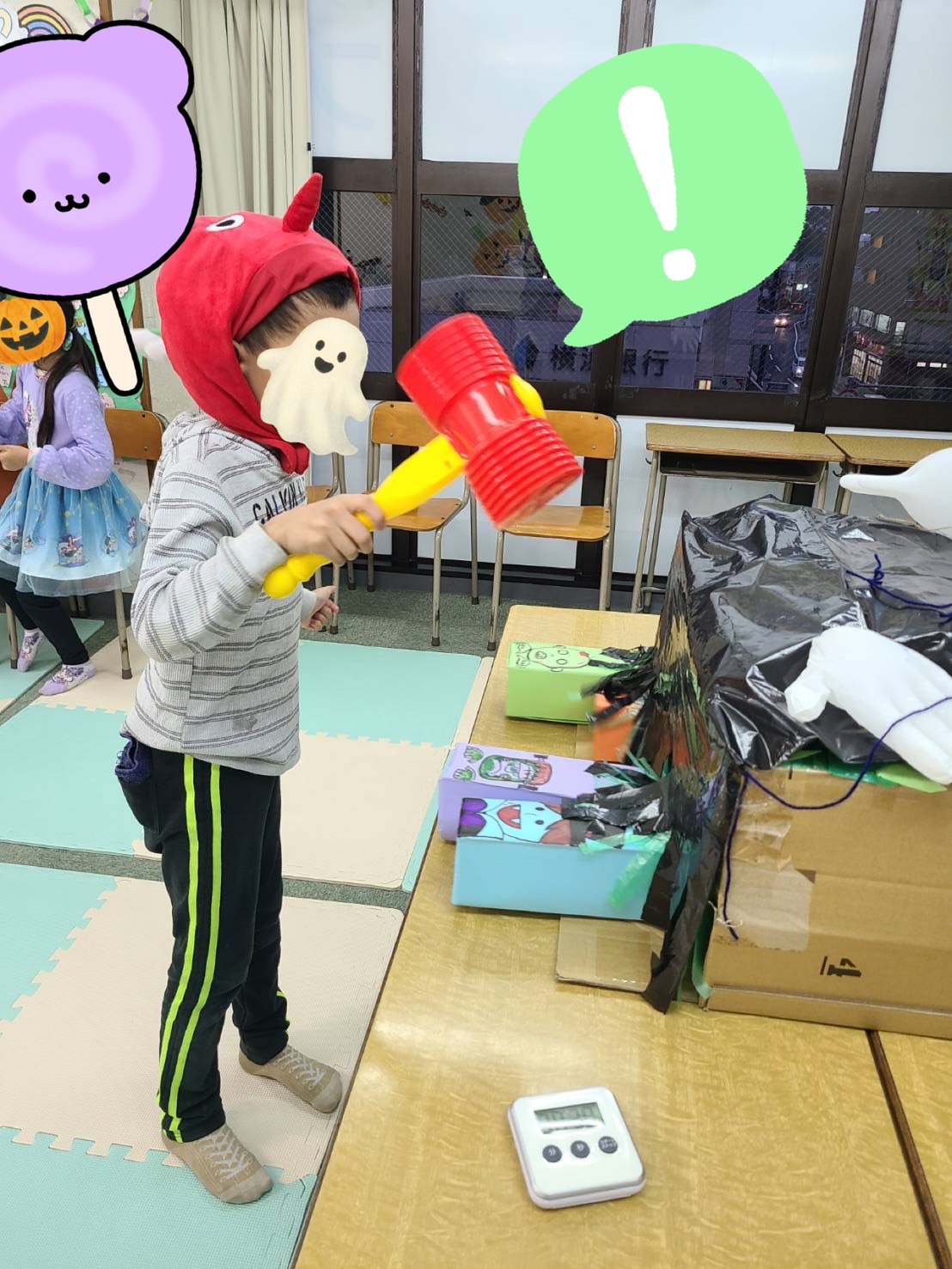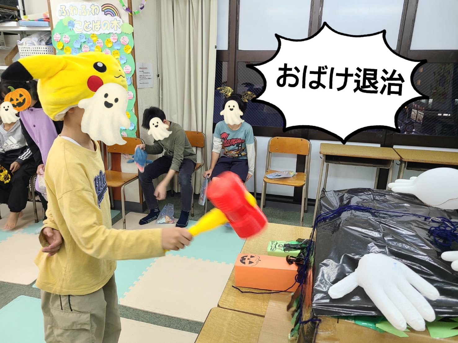 「おばけ退治」は、夏祭りで遊んだワニワニパニックをリメイク!素早く、ゆっくりでるおばけ達を一生懸命叩いていました👻