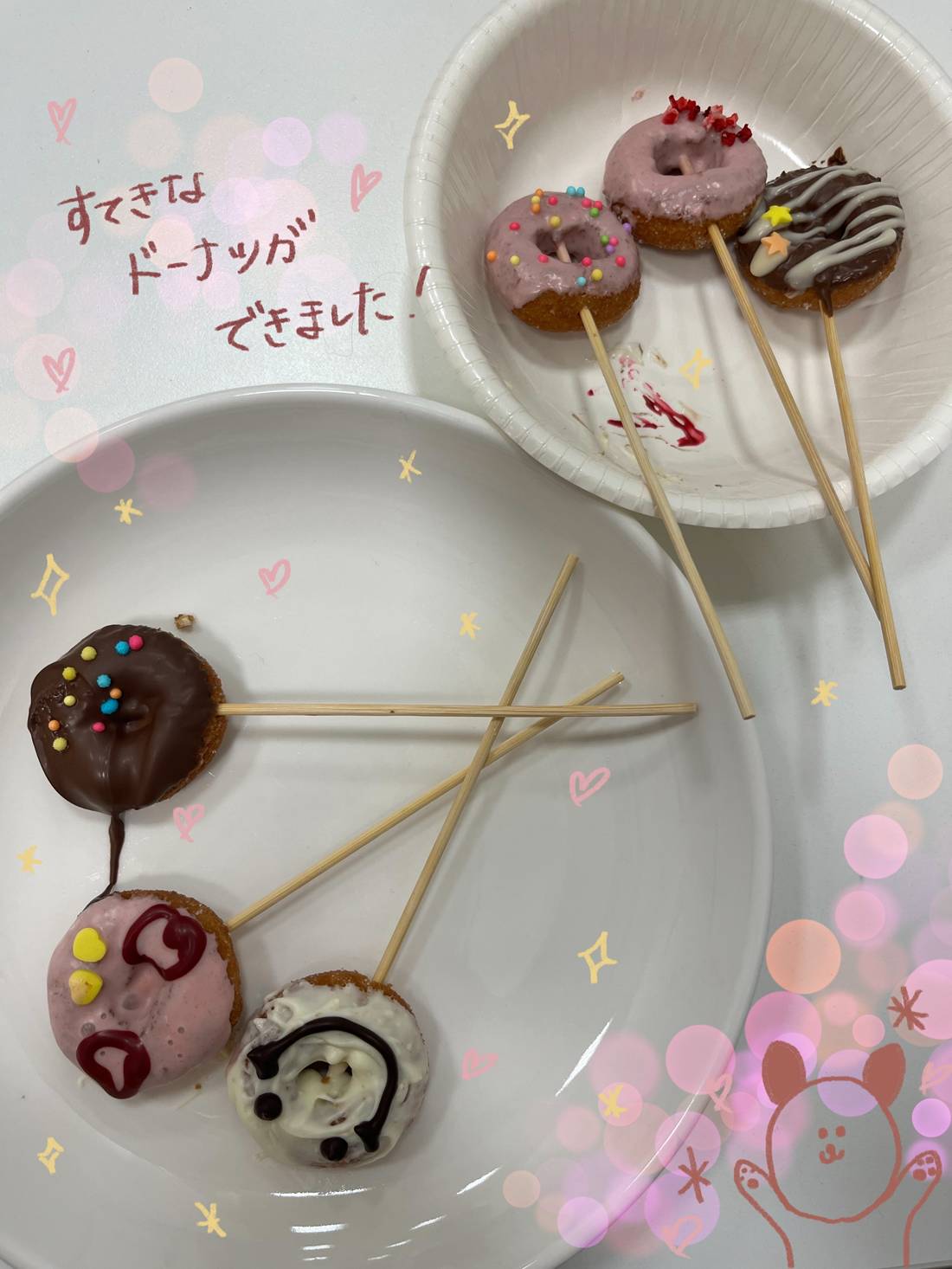 簡単にできて、最後までみんな真剣に作っていました✨いろんな表情のくまちゃんがいて可愛いです💗ただ、ロリポップ風にするには教室内が暑いとチョコパイのクリームがすぐに溶けてしまい、マドラーがとれてしまうので注意です💦
