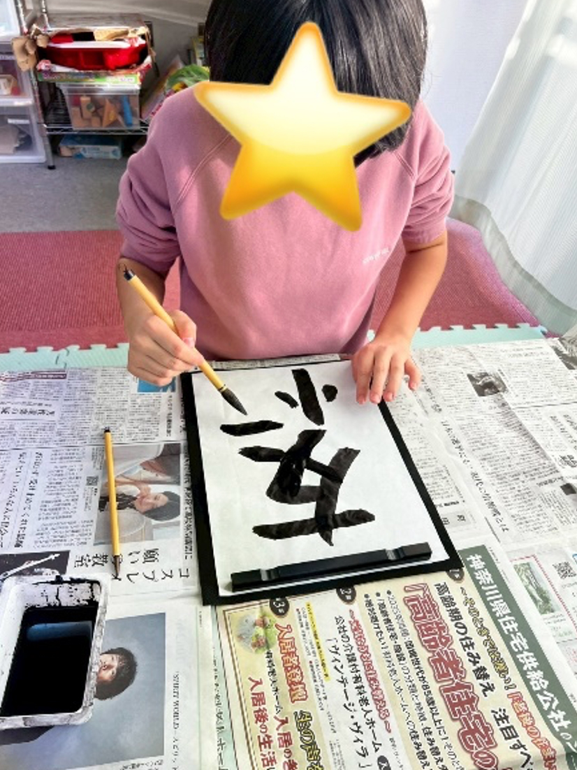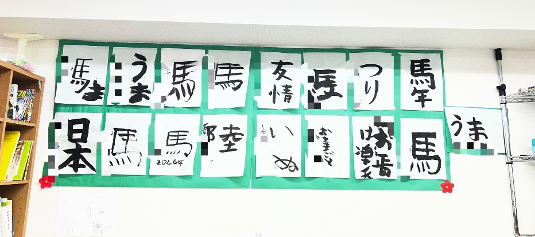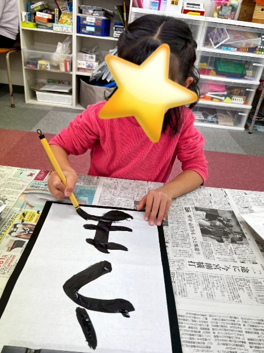 入学した頃、ひらがなも書けなかった1年生がお手本を見ながら上手に書いた書初めにスタッフみんな感動!みんなそれぞれ書きたい文字や目標など上手に書きました
